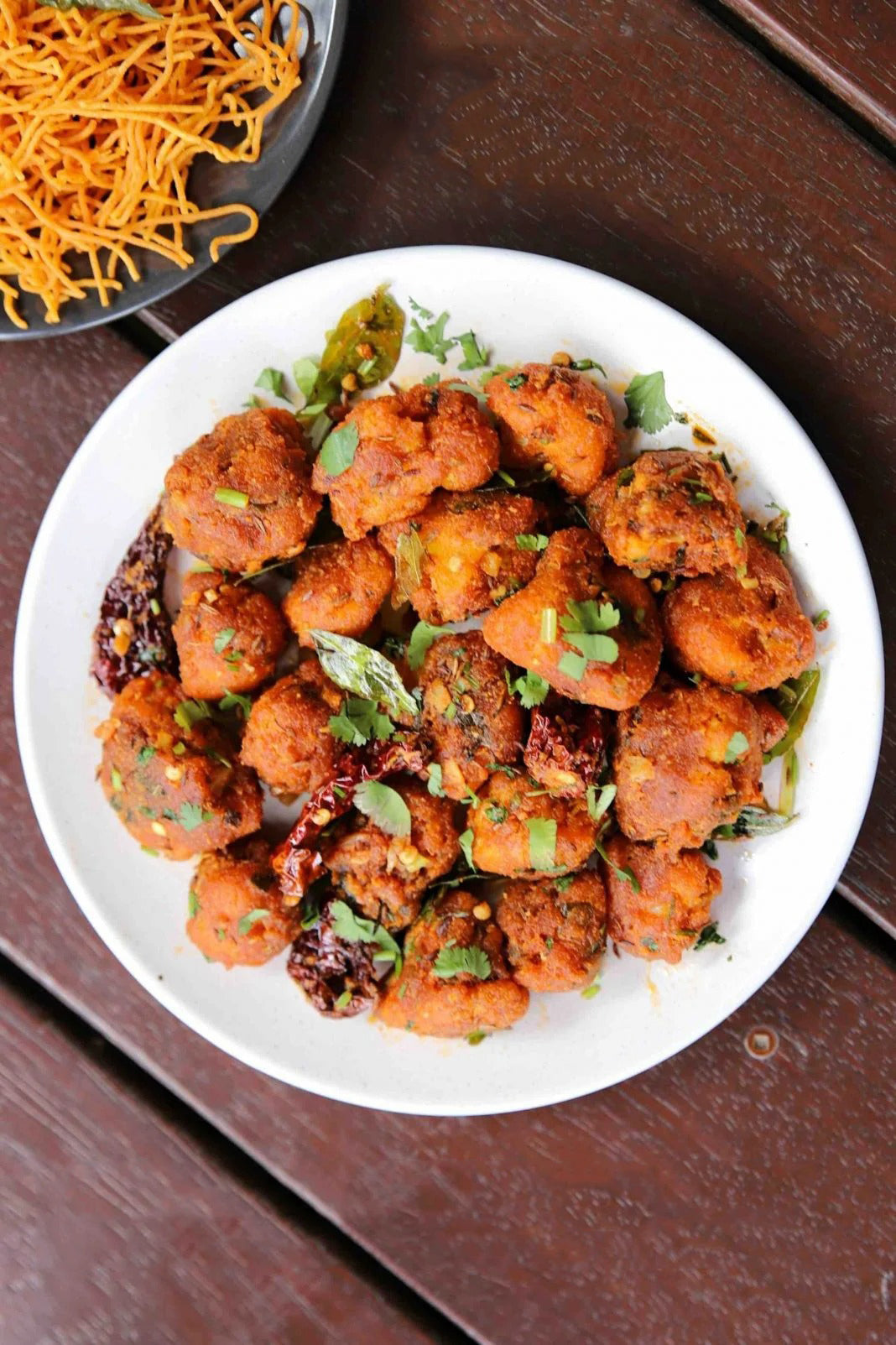Gobi 65 is a spicy and crispy South Indian-style starter made with cauliflower florets marinated in a blend of flavorful spices, deep-fried until golden, and tossed with garlic, curry leaves, and green chilies. With its bold taste and perfect crunch, it's a crowd-pleasing snack for every spice lover!